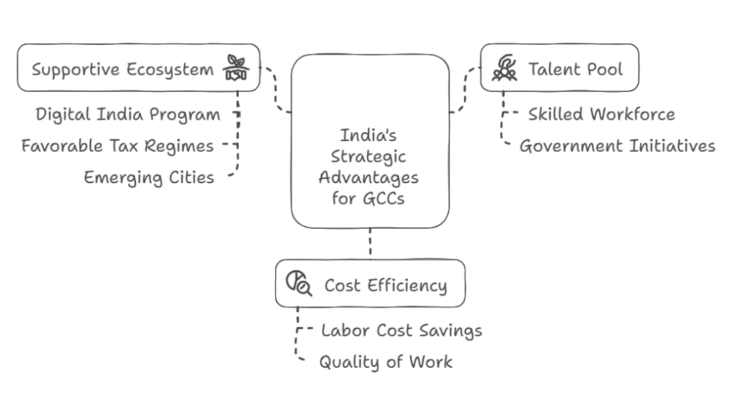 Operating a GCC in India offers significant cost advantages. According to Deloitte, companies save up to 70% on labor costs compared to developed markets like the US and Europe. These savings come without compromising on quality, as India’s professionals are known for their technical expertise and adaptability.